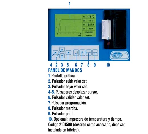 - Regulación de temperatura y tiempo a través de una pantalla gráfica que permite programar los ciclos de funcionamiento.
