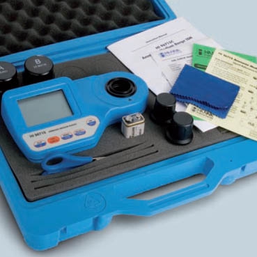 Version kit: HI96712C se suministra con 2 cubetas, pila, instrucciones, tijeras, paño de limpieza, patrón cal check y maletín robusto de transporte.