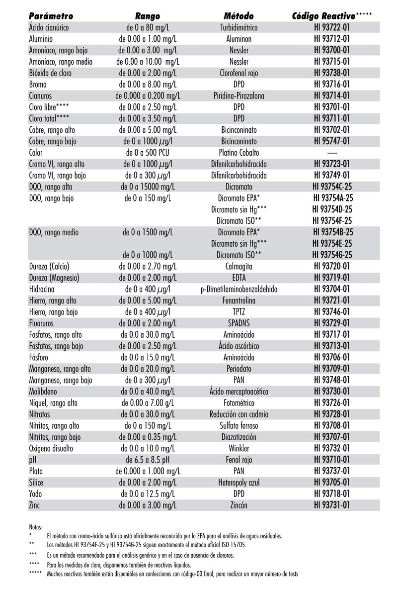 Este analizador de iones específicos está programado para analizar hasta 39 parámetros incluyendo DQO. Con el HI 83099, no hay necesidad de programaciones complicadas o instalación de filtros delicados. Con solo tocar un botón, seleccione el parámetro que desea analizar y su fotómetro está listo para medición.