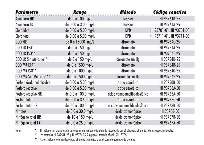 Especialmente diseñado para su aplicación en EDAR (Estaciones Depuradoras de Aguas residuales). Determinación de : Cloro (Libre y Total), Nitratos,Amonio, Nitrogeno Total, DQO y Fósforo (reactivo, ácido hidrolizable y Total) en diferentes rangos.