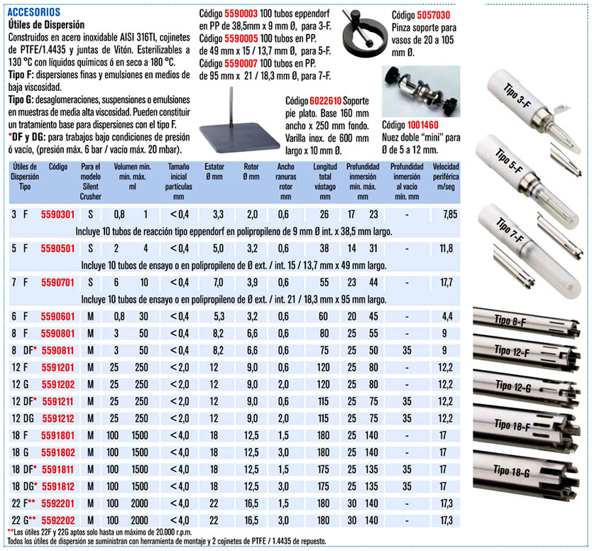 - El modelo SilentCrusher-M con tacómetro digital de r.p.m., está diseñado para volúmenes entre 0,8 y 2000 ml según útil de dispersión como accesorio.
