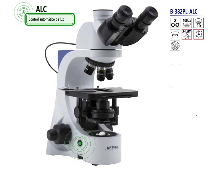 Los modelos B-382-ALC están provistos de una función especial denominada “control automático de luz” (ALC). La intensidad de luz se ajusta automáticamente en el microscopio para mantener el mismo nivel de iluminación seleccionado por el usuario, aunque éste haga cambios en la apertura del diafragma, en el objetivo o varie la opacidad de las muestras, etc.