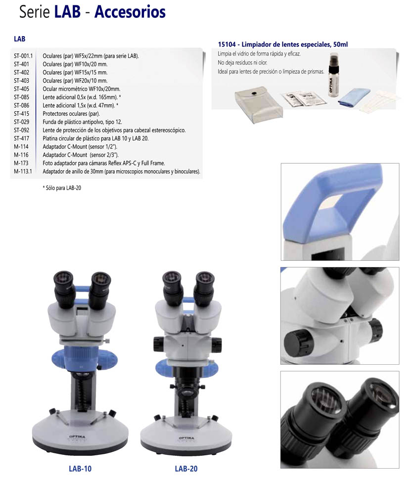 • Oculares: WF10x/20 mm. Modelo LAB-20: Compensación dióptrica en ambos tubos porta oculares.
