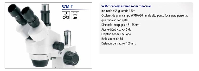 Cabezal Triocular, oculares alto punto focal WF10x/20mm, objetivo Zoom