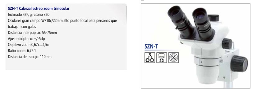 Cabezal Triocular, oculares alto punto focal WF10x/22mm, objetivo Zoom