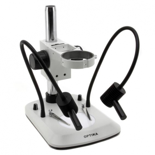 Estativo moderno con base pequeña, 2 iluminadores incidentes X-LED montados sobre brazos tipo flexo con disco interno de 100mm de diámetro que aumenta la intensidad del LED.
