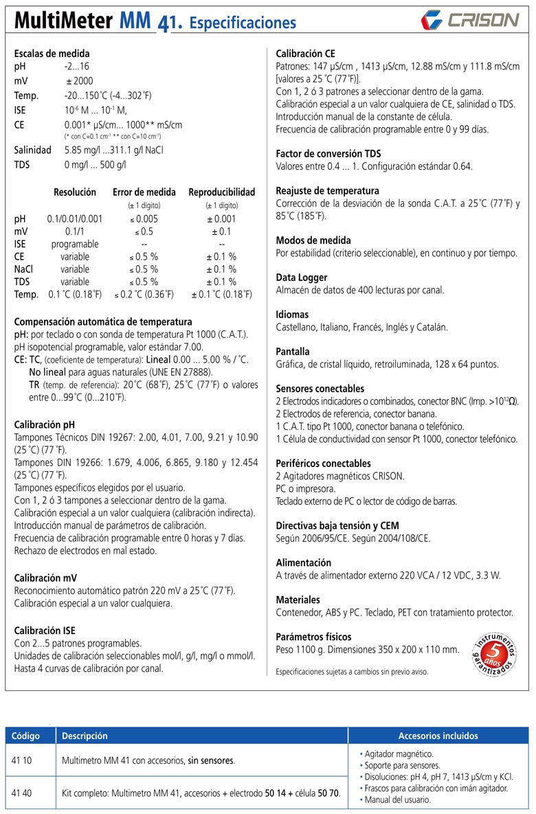 Multímetro MM-41, con accesorios, electrodo 5014 y célula 5070 (universales)