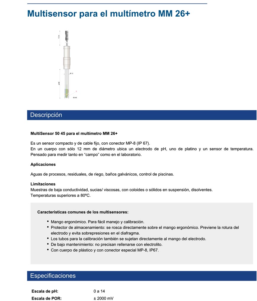 Es un sensor compacto y de cable fijo, con conector MP-8 (IP 67). En un cuerpo con sólo 12 mm de diámetro ubica un electrodo de pH, uno de platino y un sensor de temperatura. Pensado para medir tanto en “campo” como en el laboratorio.