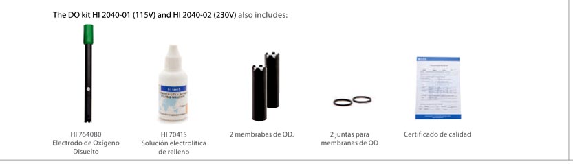 Se suministra con sonda de Oxígeno Disuelto polarográfica con sensor de temperatura HI 764080, solución electrolítica HI7041S,2 juegos de membranas y anillos, soporte de sobremesa con brazo para electrodo, soporte para fijación en pared,cable USB,adaptador de 12Vdc, certificado de calidad y manual de instrucciones.