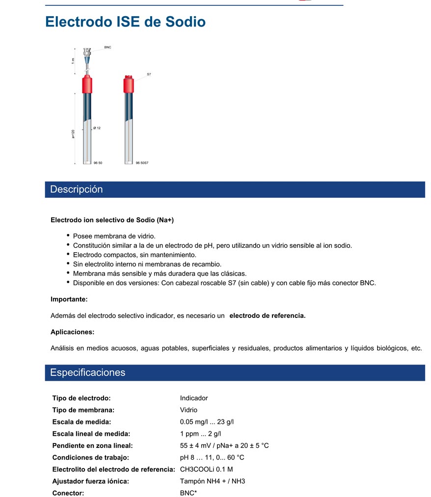 Electrodo indicador ISE, de sodio (Na+), con cable 1 metro y conector BNC