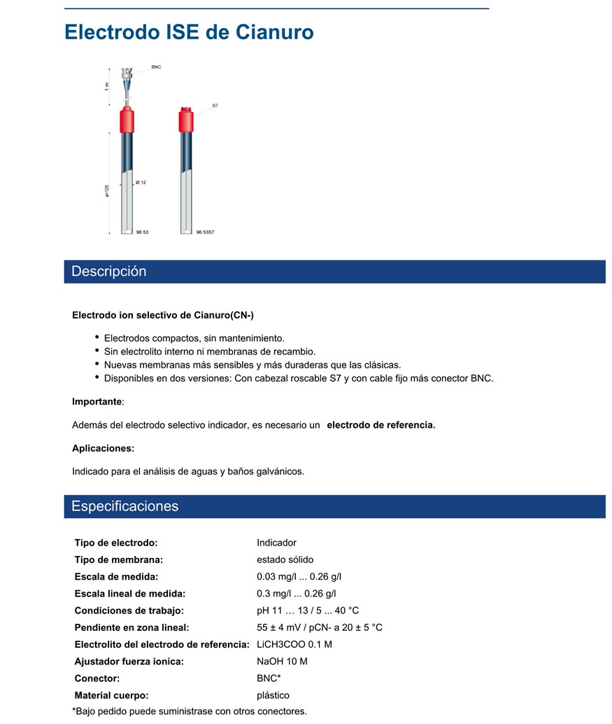 Electrodo indicador ISE, de Cianuro (CN-), con cable 1 metro y conector BNC