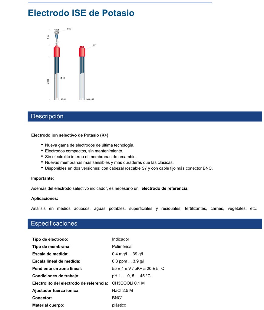 Electrodo indicador ISE, de potasio (K+), con cable 1 metro y conector BNC