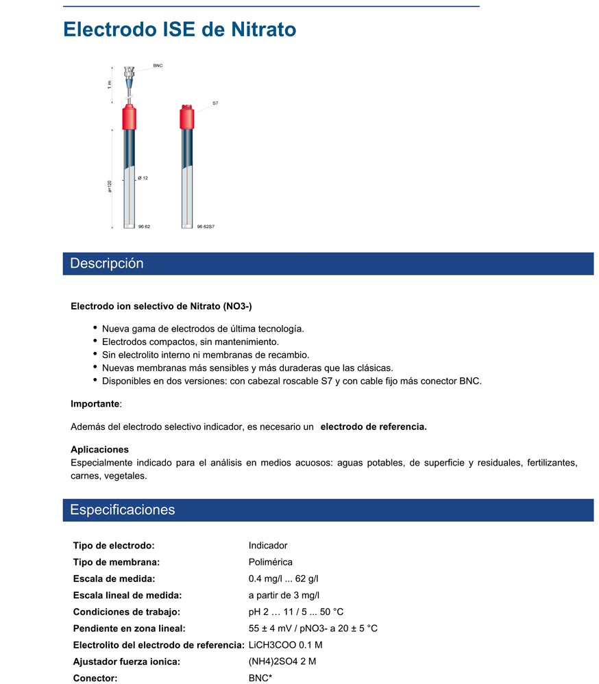 Electrodo indicador ISE, de nitrato (No3-), con cable 1 metro y conector BNC