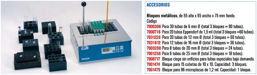 - Se suministra sin bloques metálicos, con termómetro lector 0-200 °C y varilla para la extracción de los bloques metálicos.