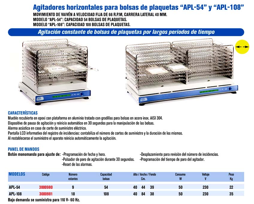 - Capacidad de agitadores para bolsas de plaquetas: 2 x APL-54.