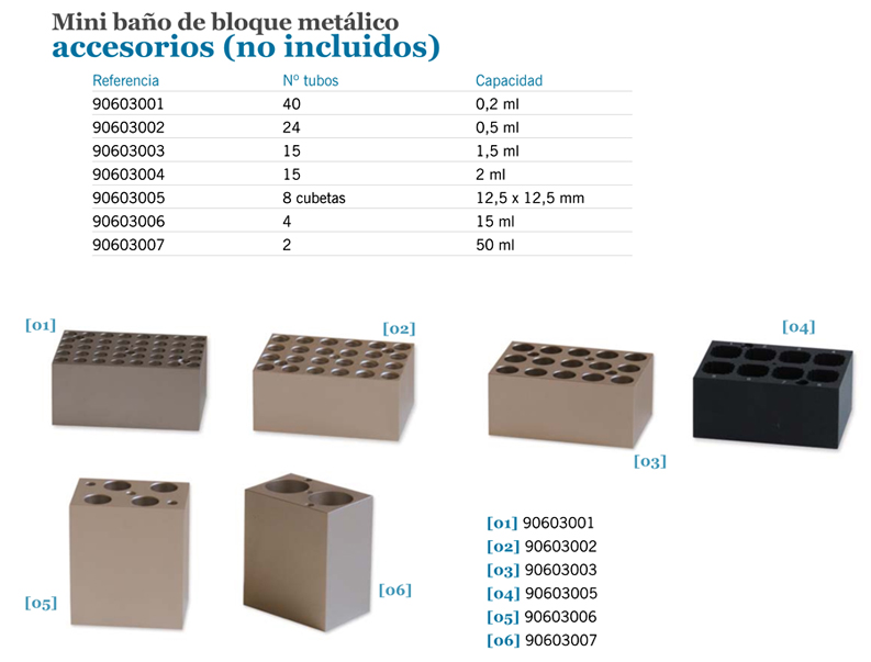 - Disponibles diversos bloques de aluminio (no incluidos) para cubrir un amplio rango de tubos (Desde 0,2 ml hasta 50 ml) y otros tipos de recipientes.