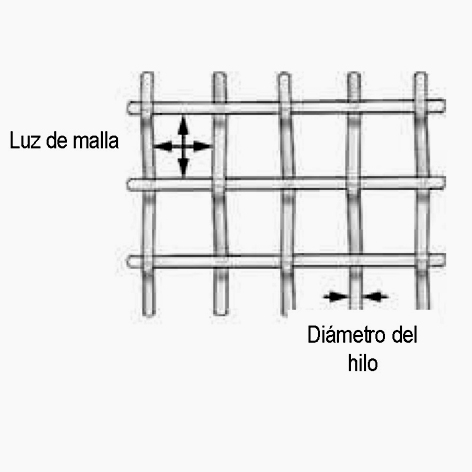 Malla (p): Suma de la luz de malla (w) y del diámetro del hilo (d).